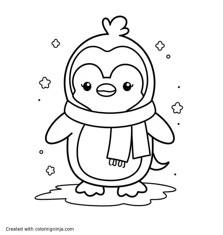 A kawaii penguin wearing a scarf, enjoying a snowy day. coloring page