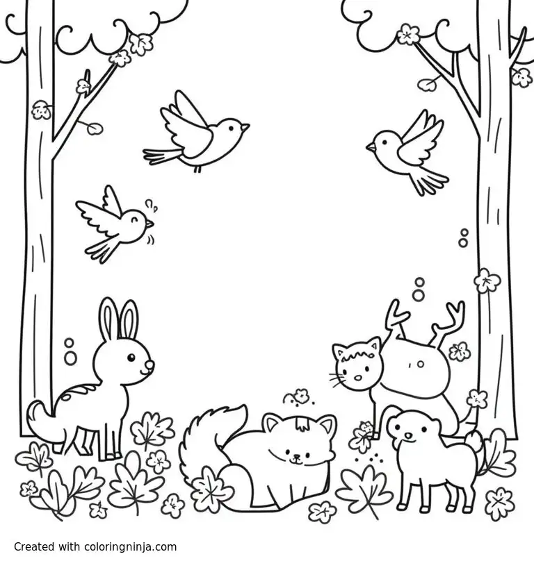 Animals in the forest and in the air, birds, bunnies, deer, and foxes playing around coloring page