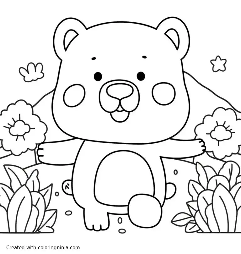 Please make, a bear with nature background in cartoon style coloring page