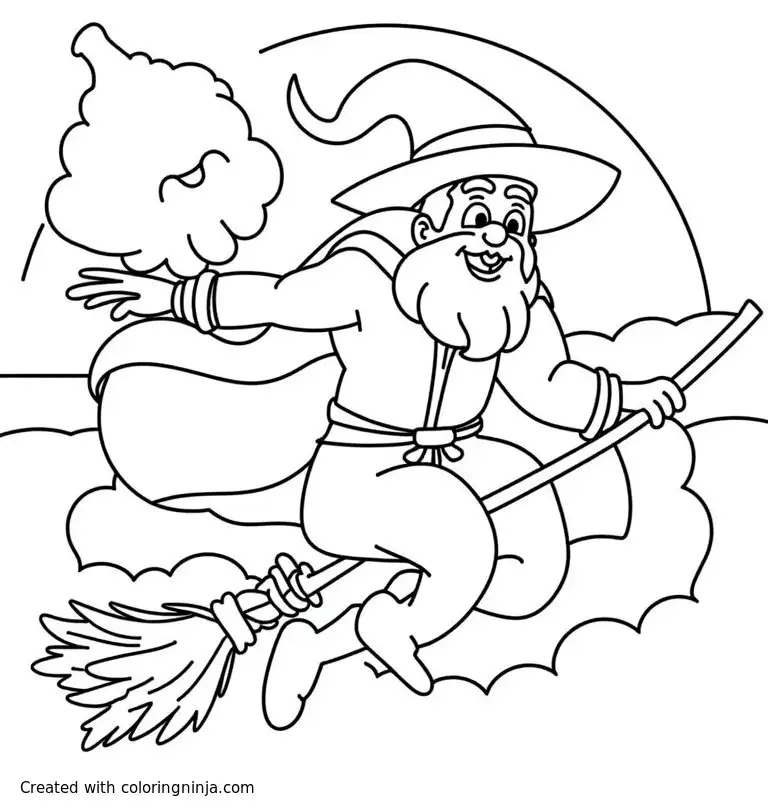 A hunky gay witch man,with an extra large hat and flowy cape, flying on a broom in a cloudy full moon night sky coloring page
