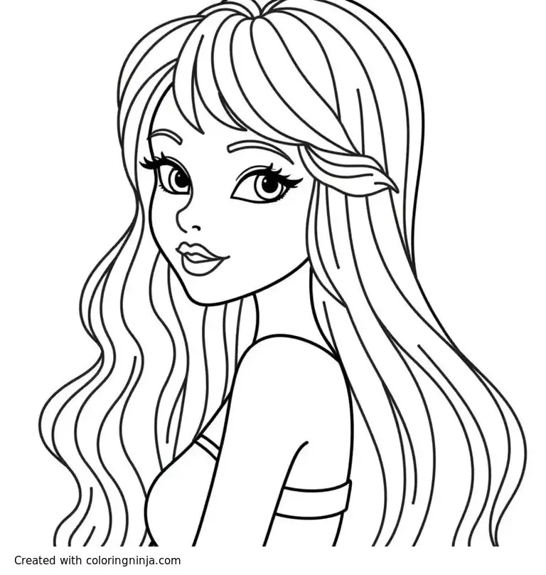 A beautiful fairy with perfect fair skin, expressive eyes and she is 5' 1" tall. Her mouth is perfectly shaped with plump lips. Her hair is long, almost to her waist and she has bangs in the front. She's very girly. coloring page