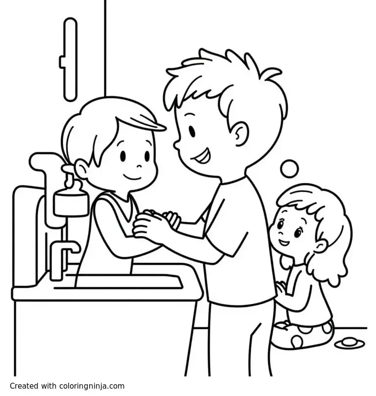A cartoon boy showing another child how to properly wash hands at a sink. His baby sister plays with soap bubbles in the background. Bathroom or preschool setting, hygiene education scene. coloring page