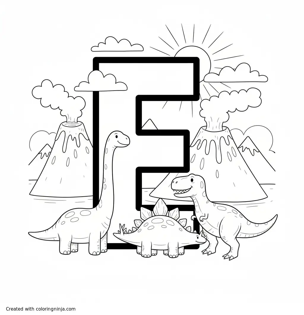 The letter "E" with dinosaurs and volcanos around it coloring page