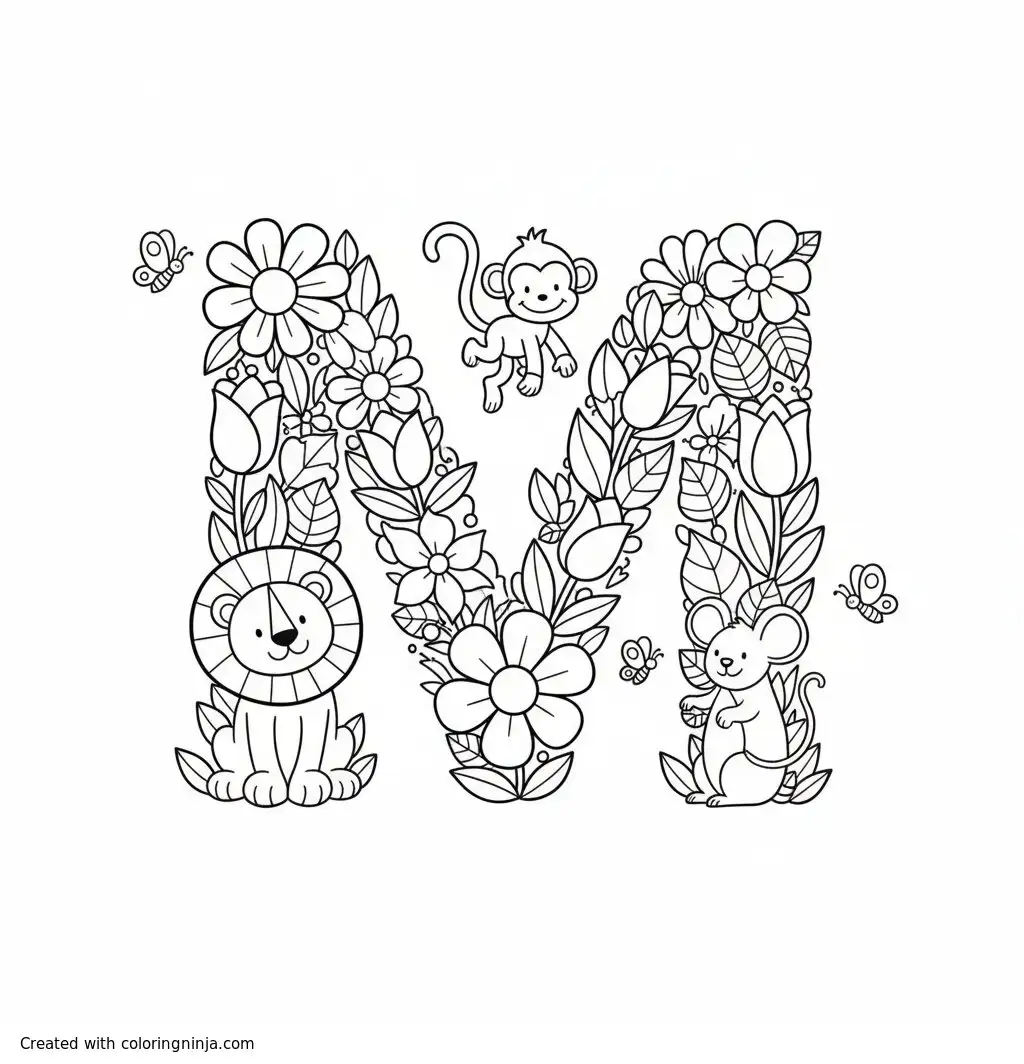 The letter "M" with flowers and animals coloring page