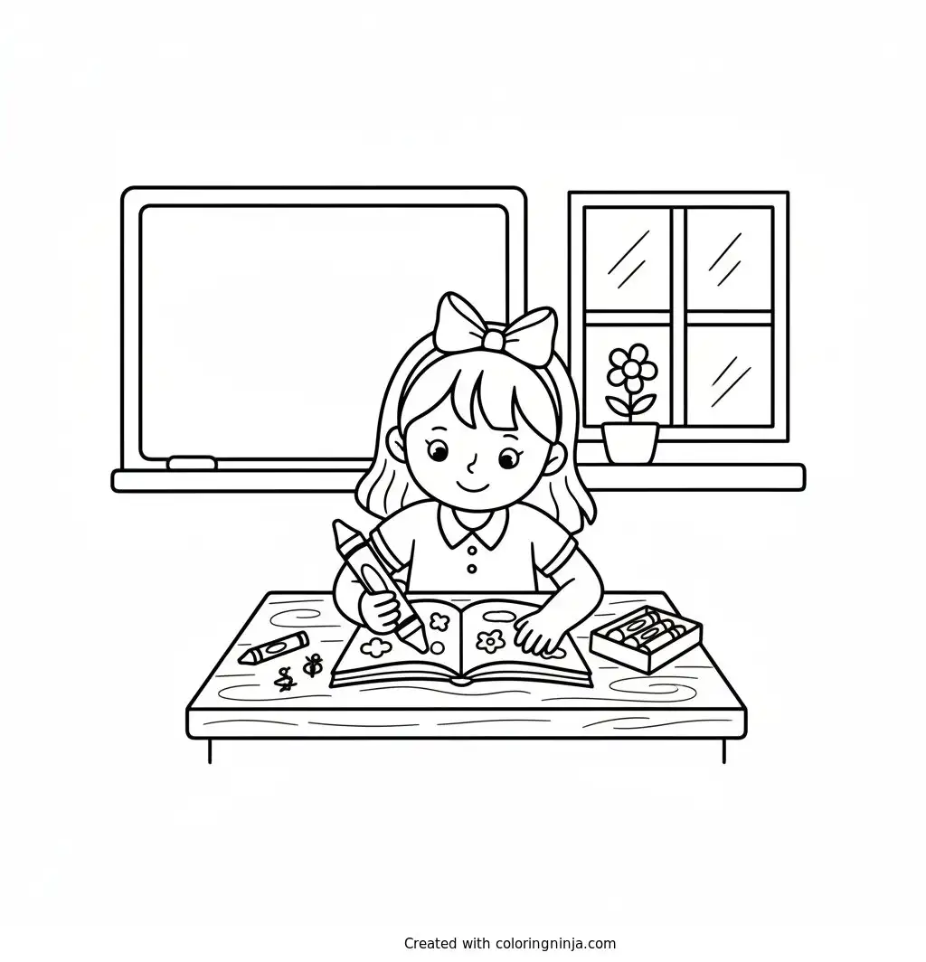 School girl sitting on his desk coloring page