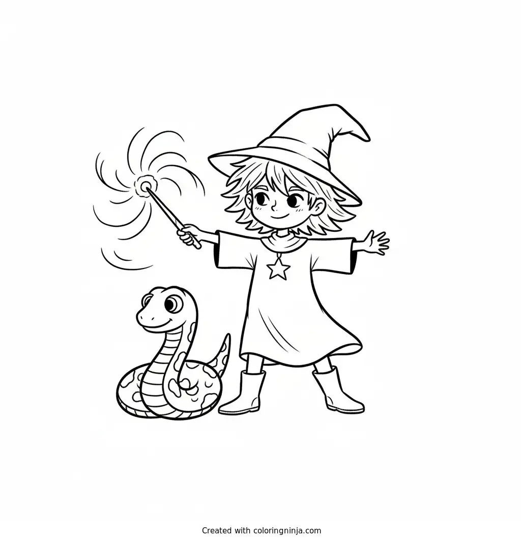 Magical boy enchanting a snakw coloring page