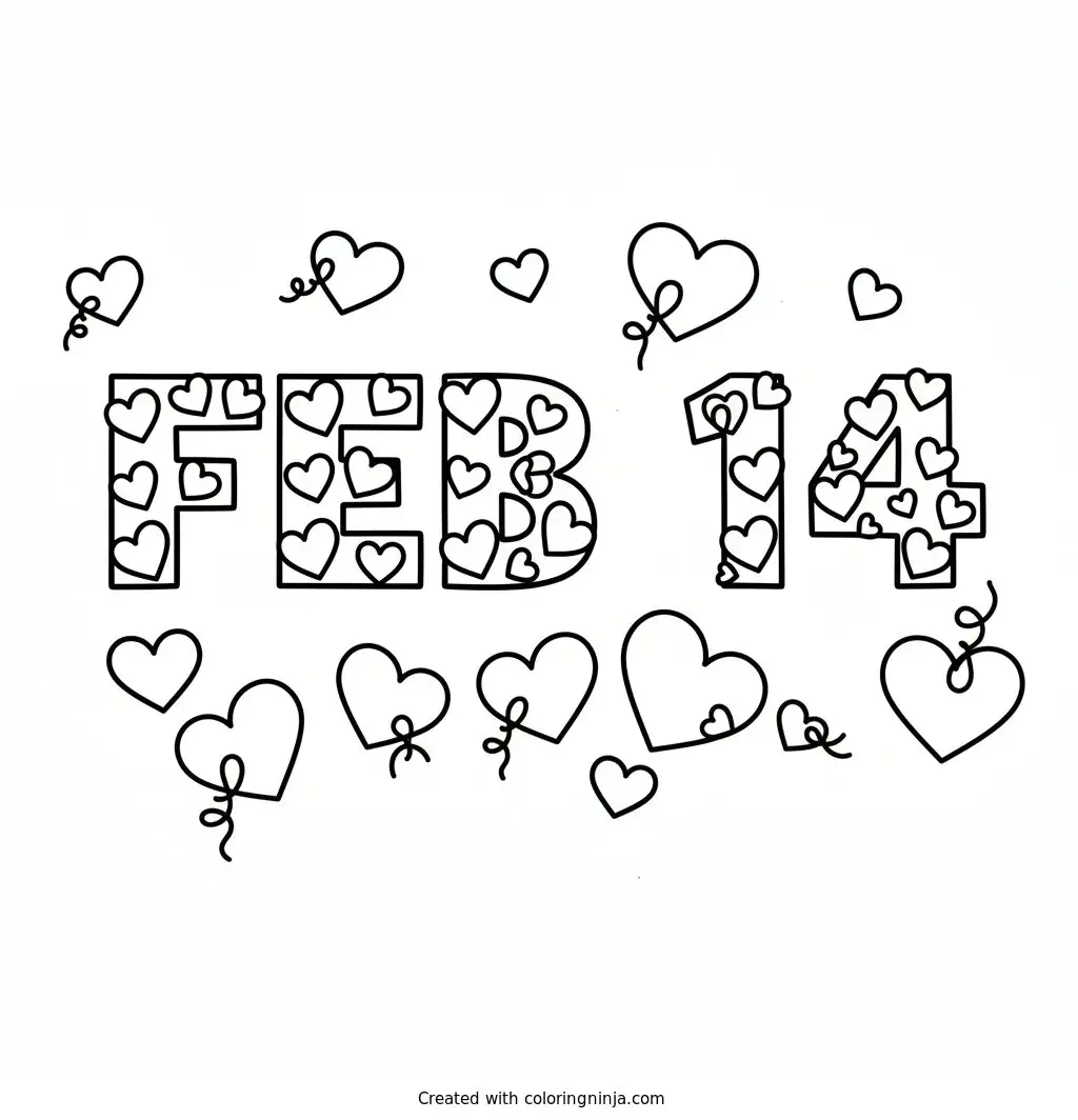 Feb 14 letters with hearts coloring page