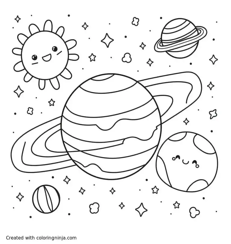Super cute coloring sheet that represents our solar system, complete with planets, the sun, and asteroid belts coloring page