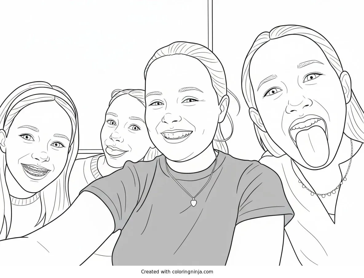 Silly Girls Smiling Together for a Selfie coloring page