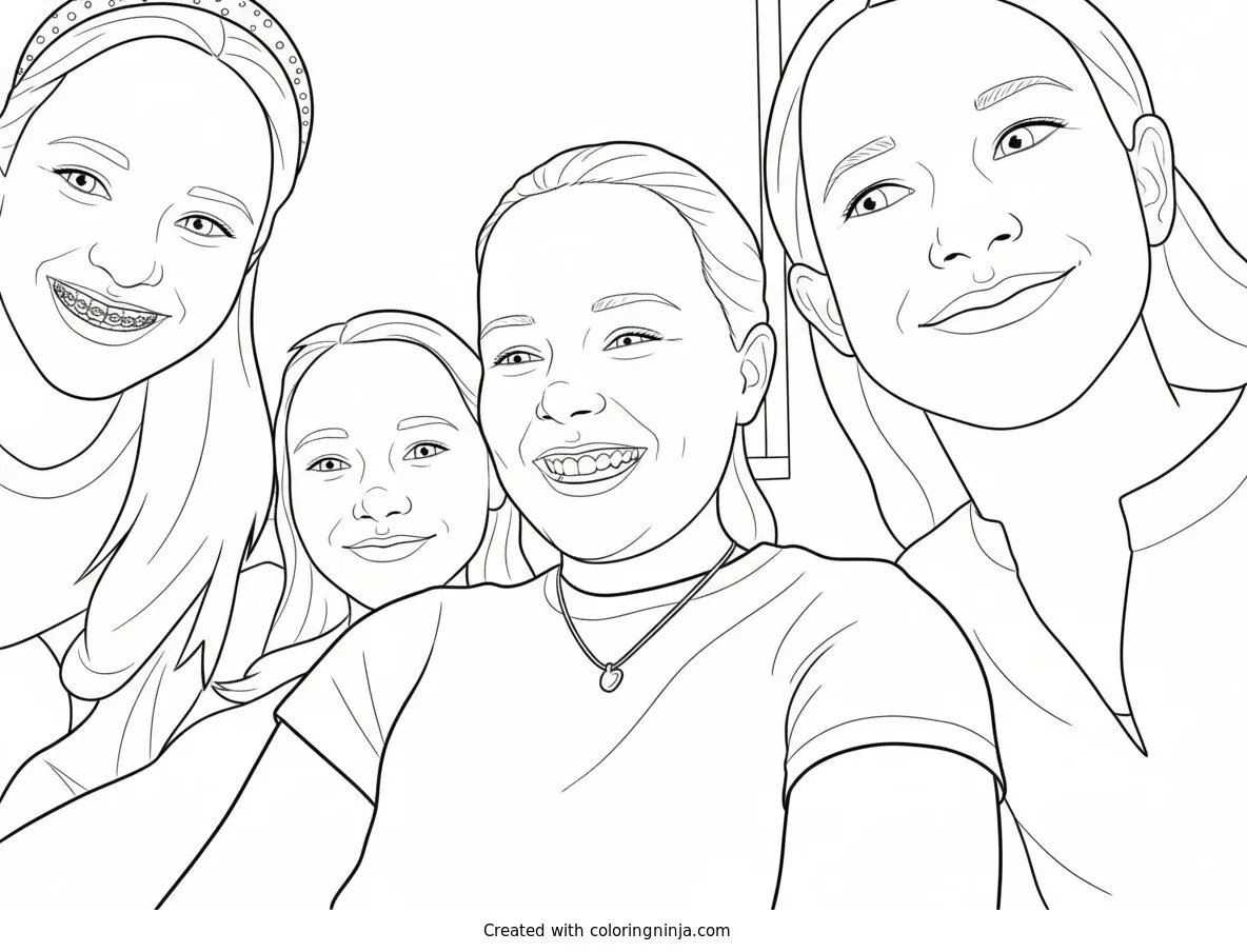 Four Smiling Girls Looking Down coloring page