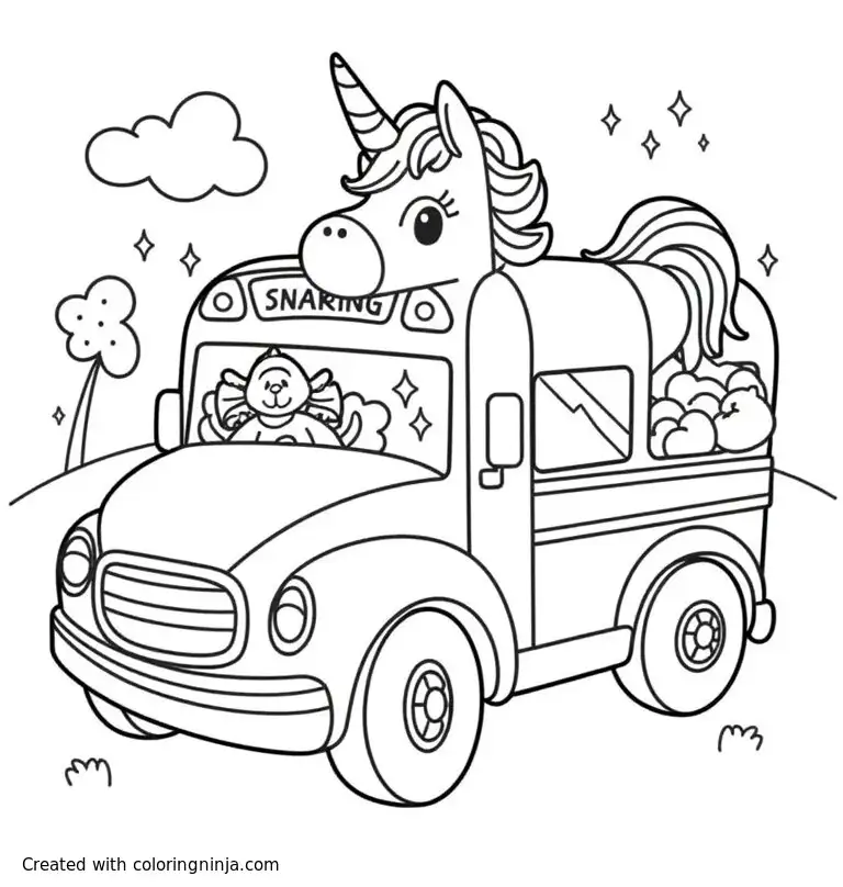 A magical unicorn driving a school bus coloring page
