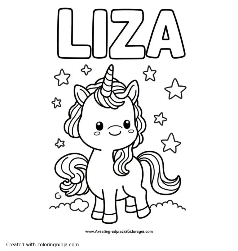 A cute unicorn with the letters “LIZA” above them coloring page