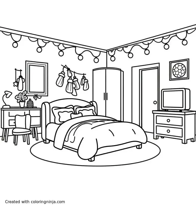 A bedroom with a big bed, a dresser and closet, a bathroom, a vanity, fairy lights, a mini fridge, a tv, and cute little decorations coloring page