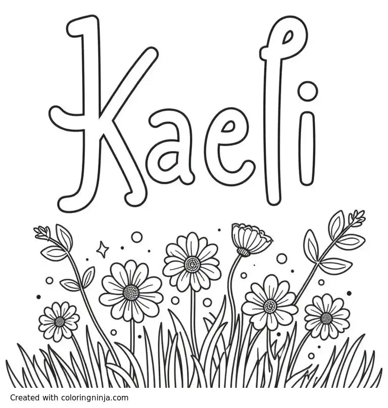 The word Kaeli with wild flowers in the background coloring page