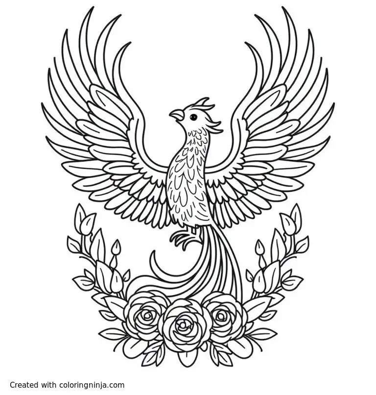 Majestic phoenix rising with wings spread, surrounded by flames morphing into roses and vines, fantasy adult coloring design, 8.5x11 coloring page