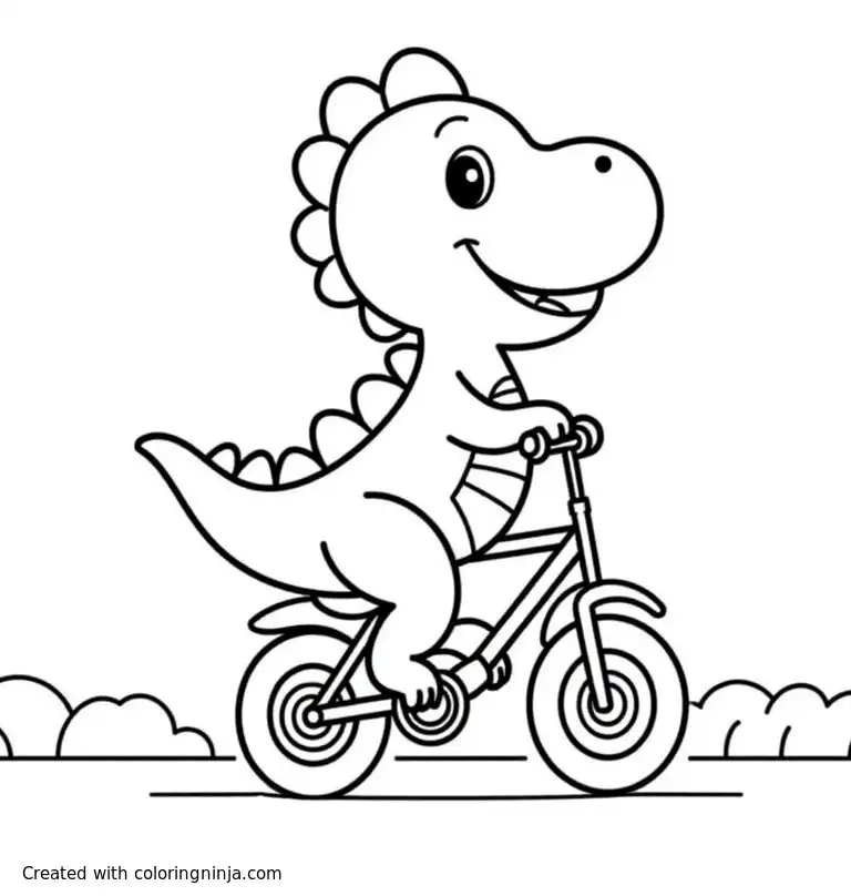 Smiling dinosaur riding bike, line art, for children coloring page