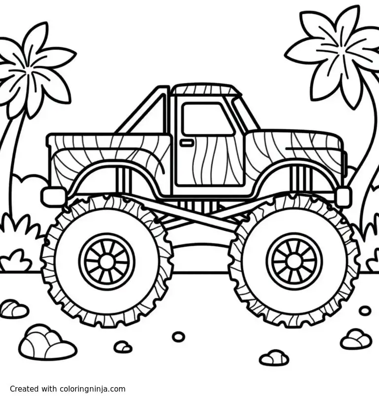 A playful monster truck with wild animal print patterns on its body. Choose tiger stripes on one side and zebra on the other for a fun look. The truck is parked in a jungle-themed background with a few palm trees and stones. Use bold patterns that are easy to color coloring page