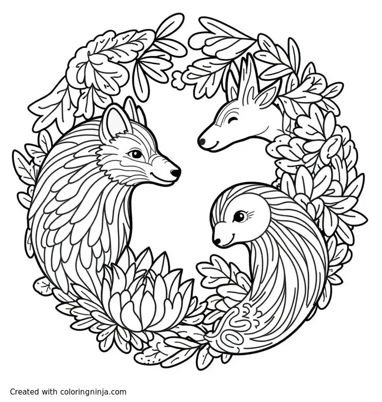 Intricate and delicate flora and fauna forest scene, beautiful animal dead and alive, yin yang, as above so below, imperfect symmetry, mythical coloring page