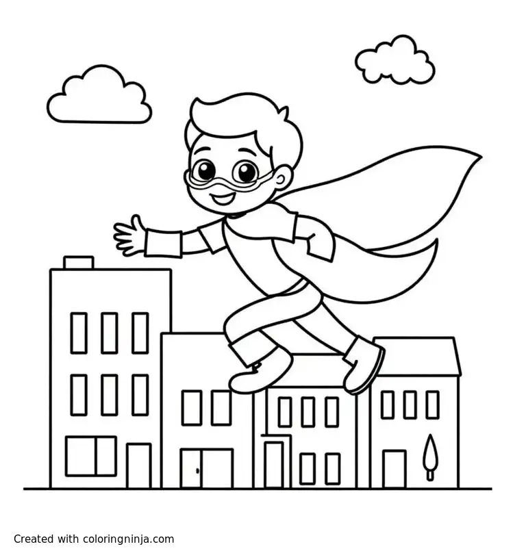 An African American boy child, dressed as a superhero. He is flying past apartment building s. coloring page