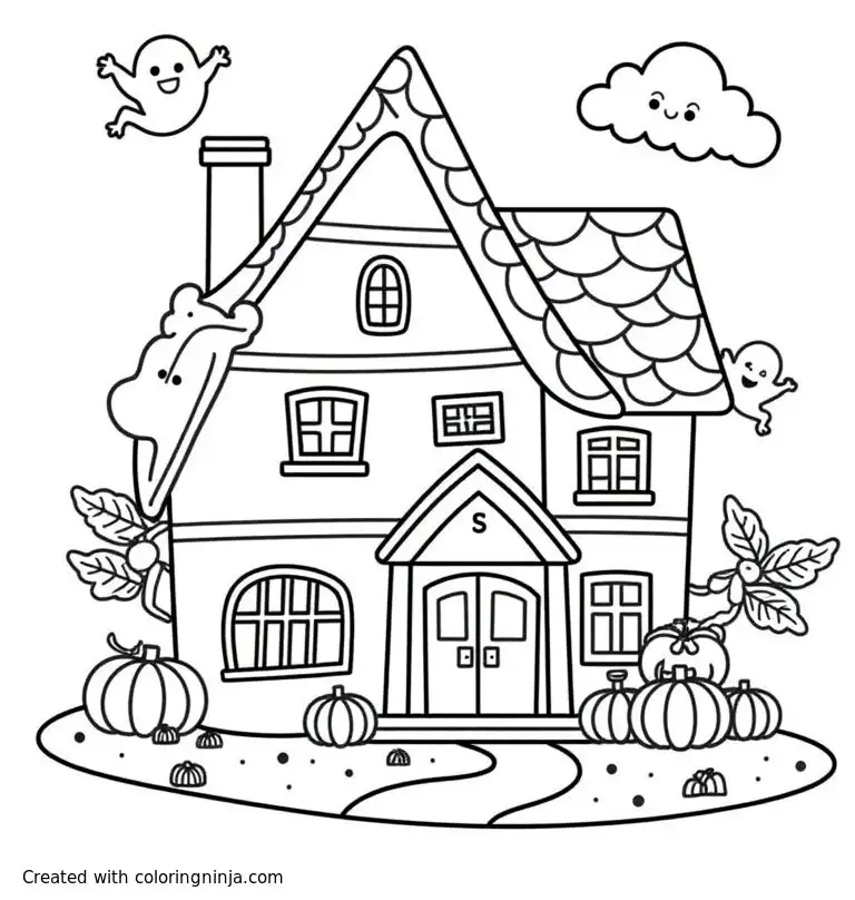 Halloween house with ghosts and skeletons coloring page