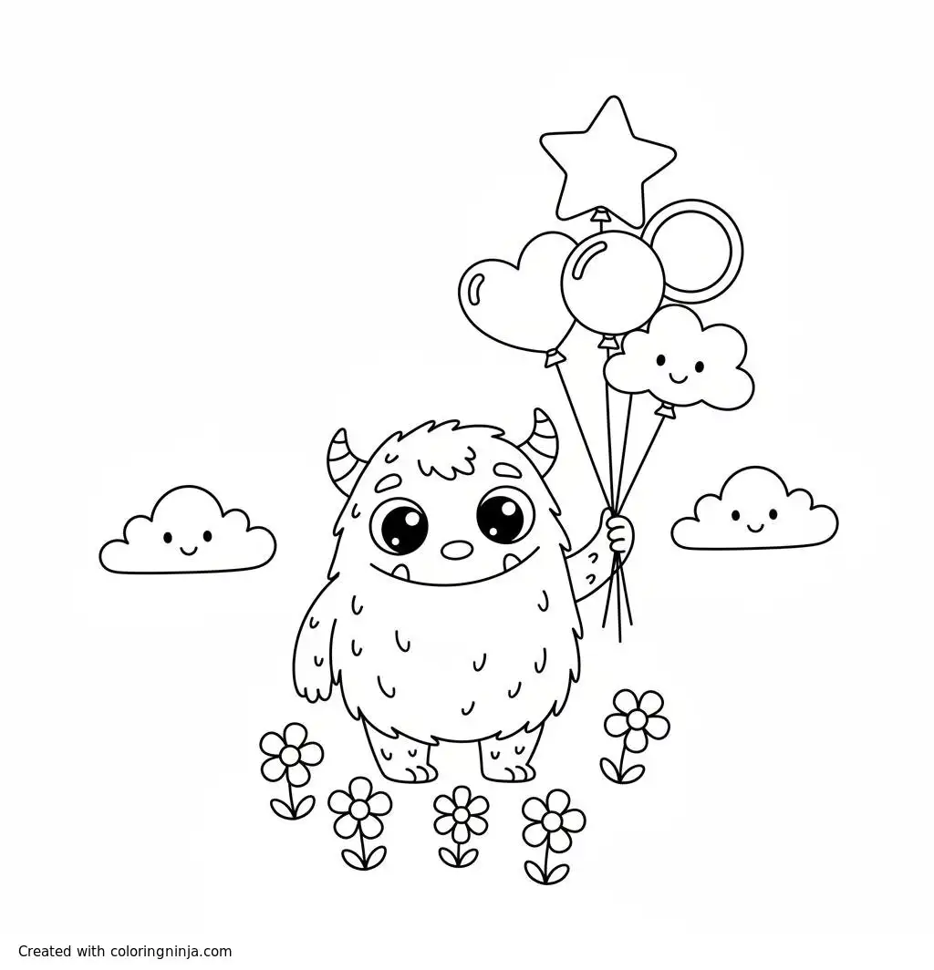 Cute Monster flying with balloons coloring page