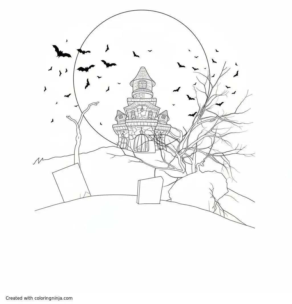 A spooky haunted house under the moon. coloring page
