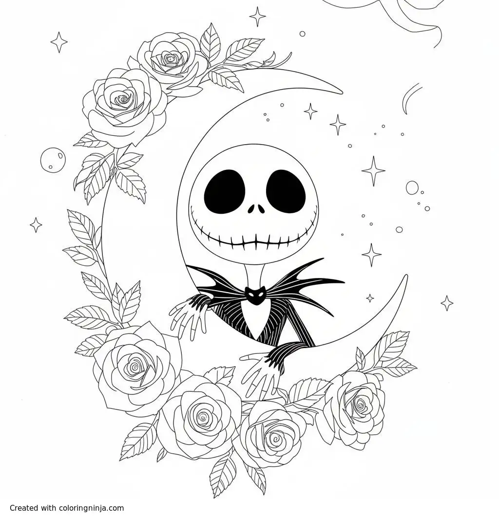 A spooky Halloween scene with a skeleton and a crescent moon. coloring page