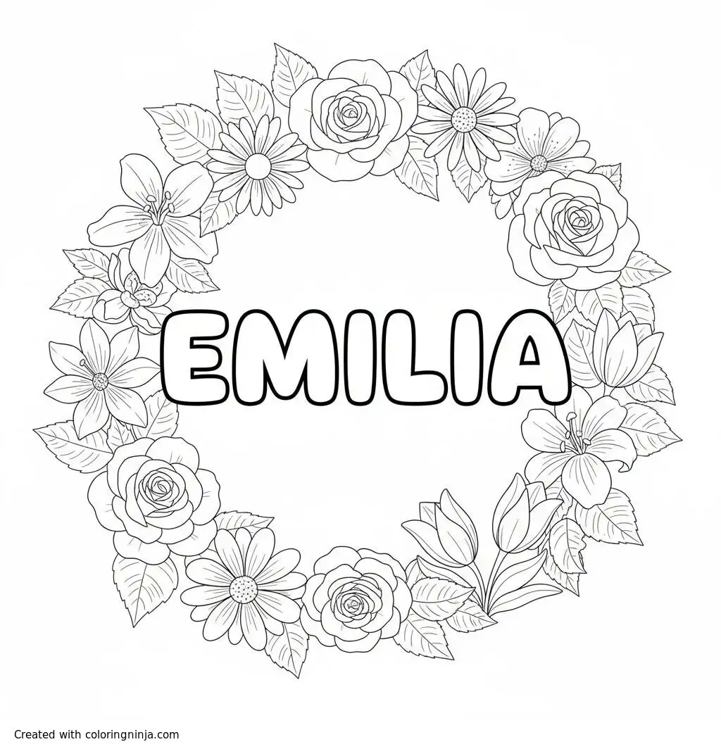 The word "Emilia" with realistic flowers around it coloring page