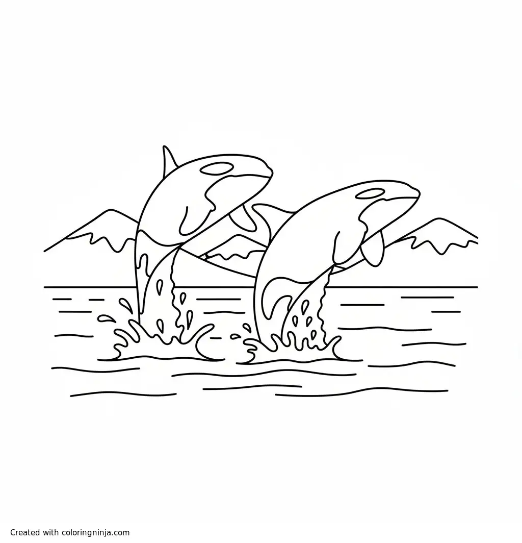 Two orcas jumping in the ocean coloring page