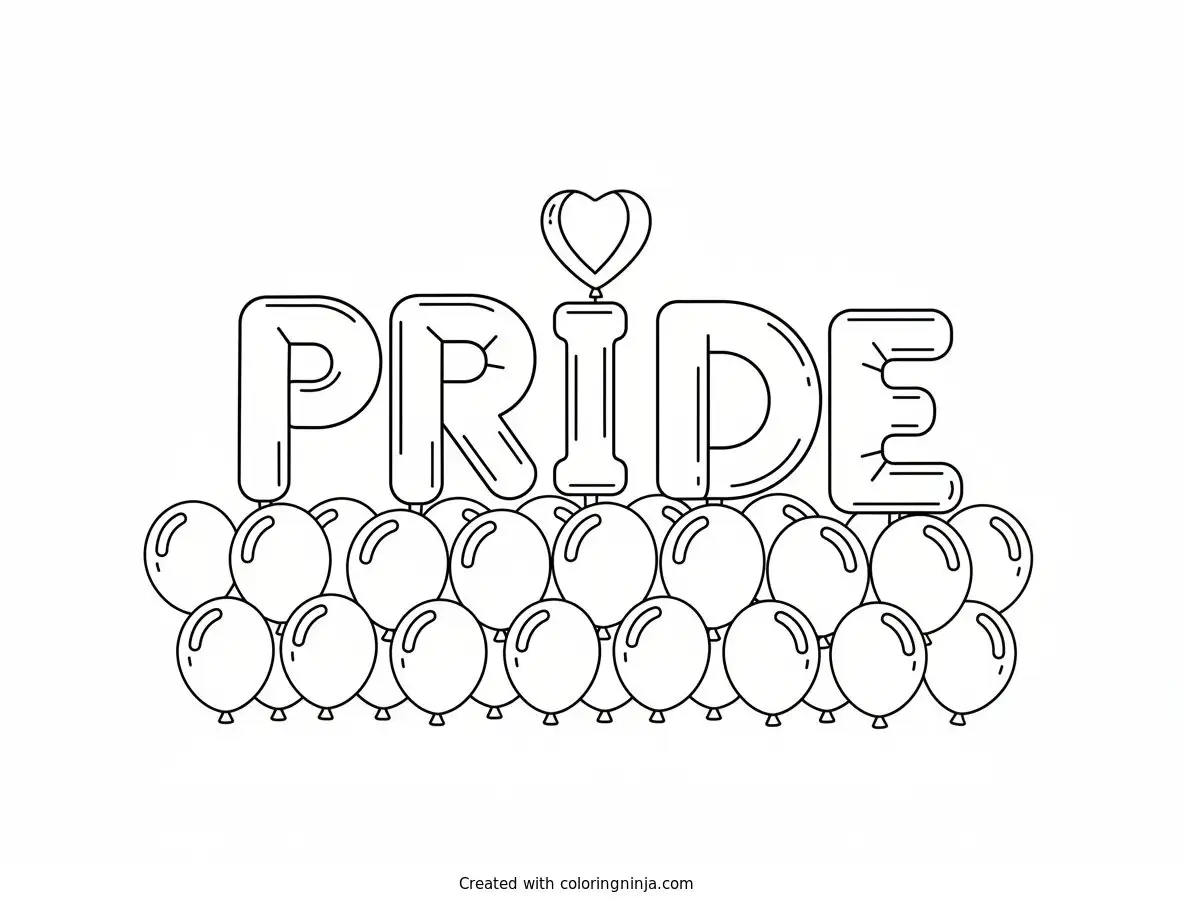 Colorful balloon letters spelling "Pride." coloring page