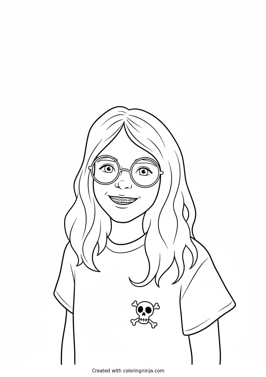 Little girl in pink shirt smiling coloring page