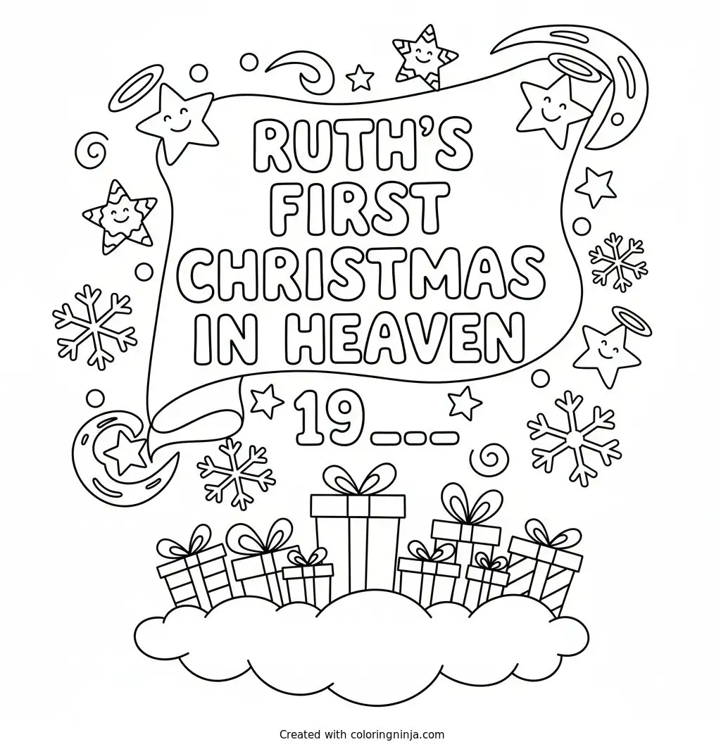 Ruth's First Christmas in Heaven 19?? Text Logo without any pictures of humans, without any pictures of animals, without any pictures of birds, and without any pictures of insects. coloring page