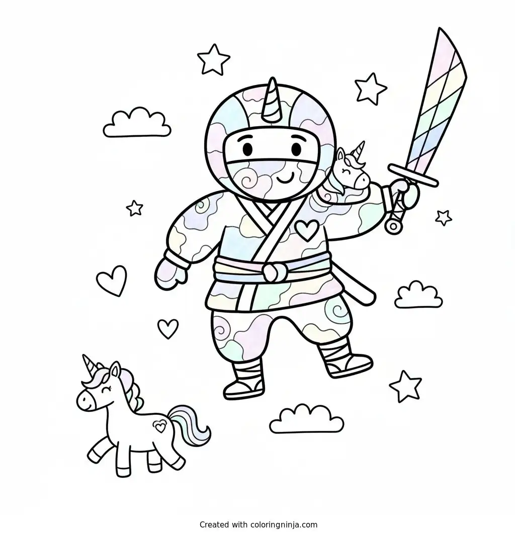 Ninja with unicorn coloring page