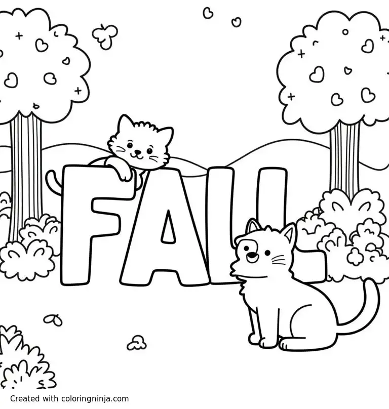 A doodle style cat and dog playing hide and seek around giant letters in a park coloring page